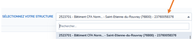 - Si vous avez des droits d’accès sur plusieurs établissements, sélectionnez d’abord l’espace de la structure sur laquelle vous souhaitez intervenir. Le choix de cet espace détermine ensuite l’affichage de tous les autres éléments (fiche structure, formations, contacts …).