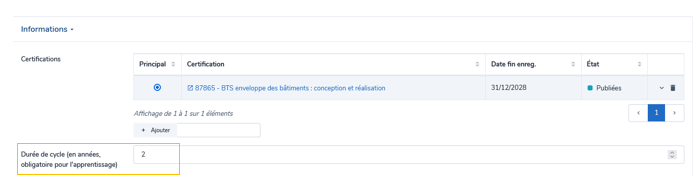 - La durée de cycle (en année) : obligatoire pour l’apprentissage, la durée de la formation correspond au nombre d’années nécessaires pour que le cycle de la formation soit validé.