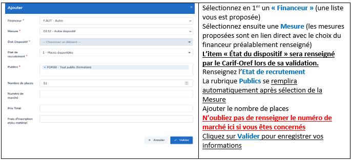 Ces 2 rubriques sont des champs textes à renseigner si besoin (obligatoire cependant pour les formations conventionnées Conseil régional – cf cadres de saisies fournis par la Région)