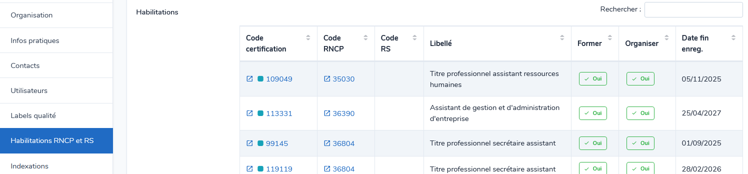 Dans votre fiche STRUCTURE, allez sur l'onglet "Habilitations RNCP / RS" et vérifier si le code RNCP de votre saisie en cours est bien affiché.