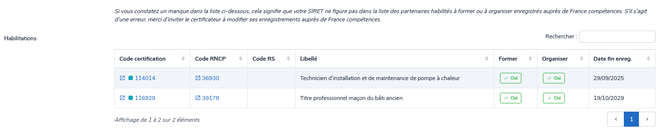 Si vous constatez un manque dans la liste, cela peut signifier que votre SIRET ne figure pas dans la liste des partenaires habilités à former ou à organiser enregistrés auprès de France compétences. S’il s’agit d’une erreur, merci d’inviter le certificateur à modifier ses enregistrements auprès de France compétences.