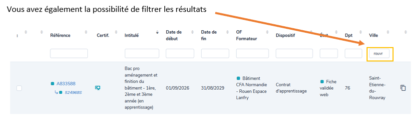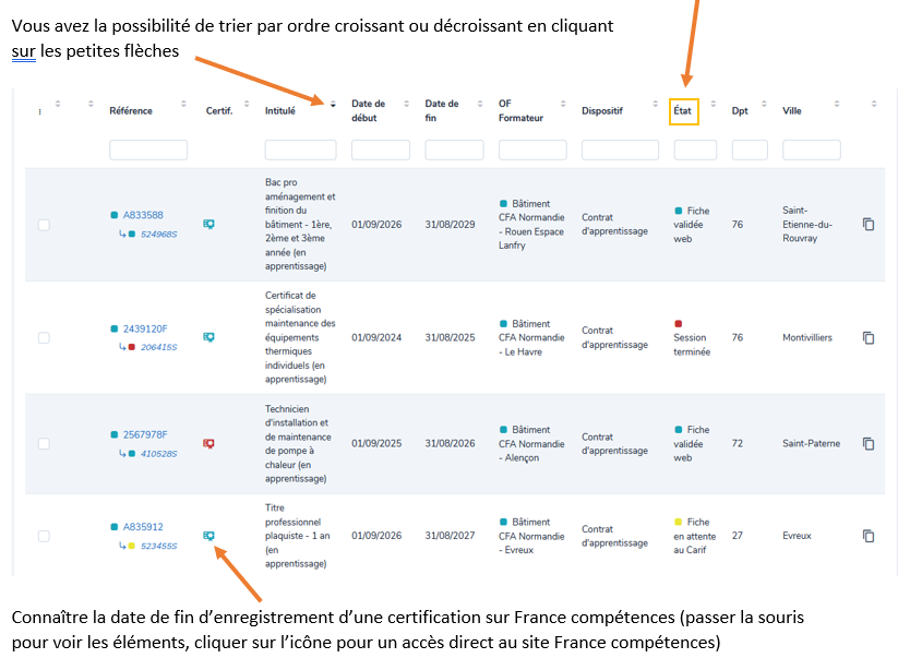 Avertissement : un affichage couleur ou la colonne État vous indiquera si votre session est terminée, diffusée ou en attente (vous ne voyez plus celles qui sont définitivement archivées).