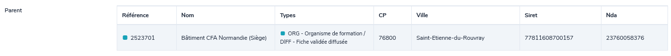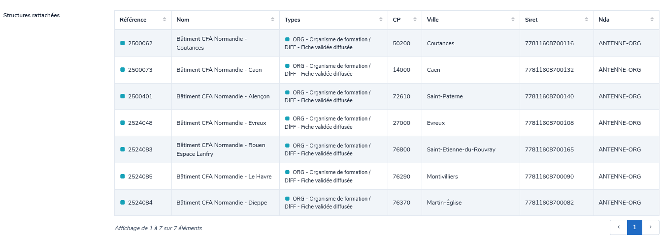 Vous êtes sur la fiche structure "Responsable" et vous visualisez la liste des structures rattachées (antennes, établissements secondaires …)