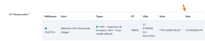L’organisme responsable : correspond à l’organisme que vous avez sélectionné dans votre espace structure (voir page 1). Attention à bien sélectionner l’organisme porteur du numéro de déclaration d’activité qui seul, est considéré comme organisme responsable !